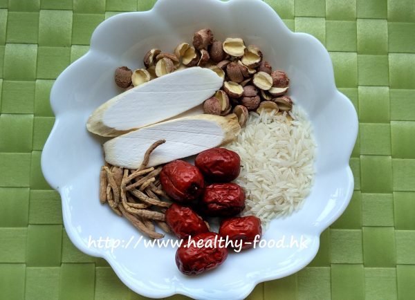 用料是:太子參3錢,淮山1兩,蓮子1兩,紅棗8~10粒,白米適量。