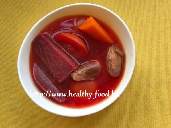 做法:紅菜頭、番茄、紅蘿蔔洗淨,去皮後切塊;椰棗去核;全部材料用6~7碗水煮1小時成4碗即可連湯料同食。