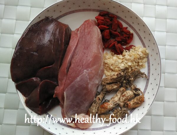 用料是:金蟬花4錢,蕤仁肉3錢,杞子3錢,豬肝4兩,瘦肉6兩。