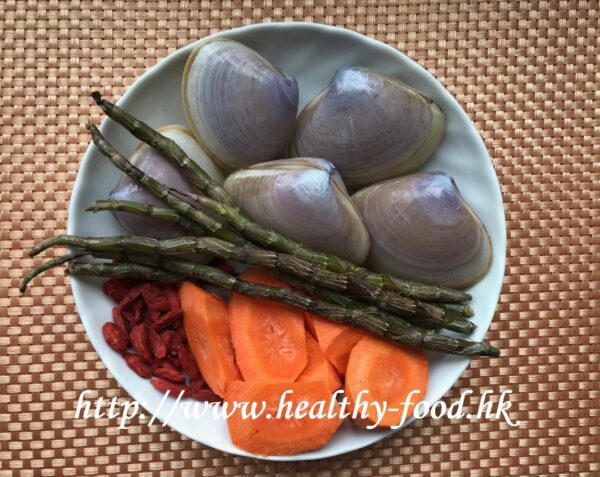 做法:鮮石斛沖洗後切段;杞子浸洗;紅蘿蔔去皮後切塊;貴妃蚌用温水浸片刻等吐出細沙;先將鮮石斛、紅蘿蔔、杞子,生薑用6~7碗水煮半小時,加入貴妃蚌,煮10分鐘即可連湯料同食。