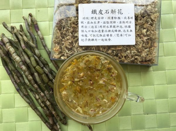 在上環西營盤一些中藥海味店見有新鮮的鐵皮石斛,買了一大扎才60元左右,由於現在大量人工培植,所以售價越來越便宜。除了鮮鐵皮石斛,還有鐵皮石斛花賣,以前我曾經買過,要80多元1兩,現在一兩才30多元,所以買了一盒回家即時沖泡,氣味清香,而且沖泡後的花像煮熟的金針一樣可以咀嚼食用。