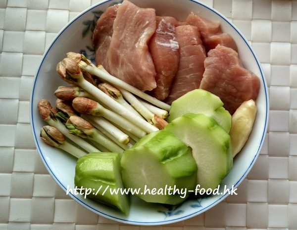 用料是:合掌瓜2個,花生芽1盒,生薑3片,瘦肉12兩。