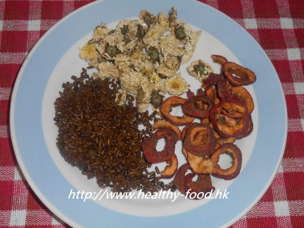 用料是:炒香決明子、山楂、菊花各1湯匙。