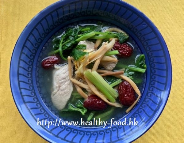 做法:金針浸洗;香芹去根洗淨,切段;紅棗去核;瘦肉切片後出水;先將金針、紅棗、瘦肉用6碗水煮至大滾,加香芹再煮20分鐘即可連湯料同食。