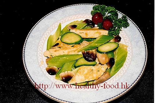 用料: 鯪魚肉4兩, 西芹4兩, 青瓜仔1條, 草菇2兩, 薑茸1茶匙, 蛋清1個,調味適量.