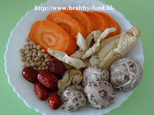 用料是: 竹笙3錢,香菇6朵,黃豆2兩,甘筍1個,紅棗6粒.