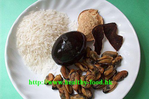 用料是: 皮蛋1~2個, 淡菜2兩,陳皮2塊,白米2兩.