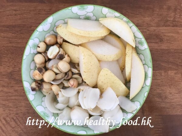 做法:鮮蓮子開邊後去芯;鮮百合剝開沖洗淨;雪梨連皮洗淨,切塊去核;全部材料用7碗水煮半小時成4碗,加入冰糖煮溶即可供食。