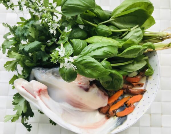 用料是:芫茜3棵,羅勒葉3棵,黃薑5錢,大魚頭1個。