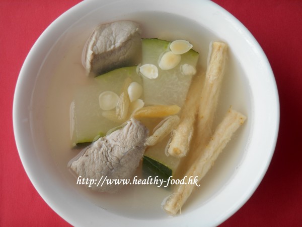 做法: 冬瓜連皮洗淨,切塊;瘦肉出水;其餘材料浸洗;將全部材料放入煲內,用8碗水煮1小時即可供飲.