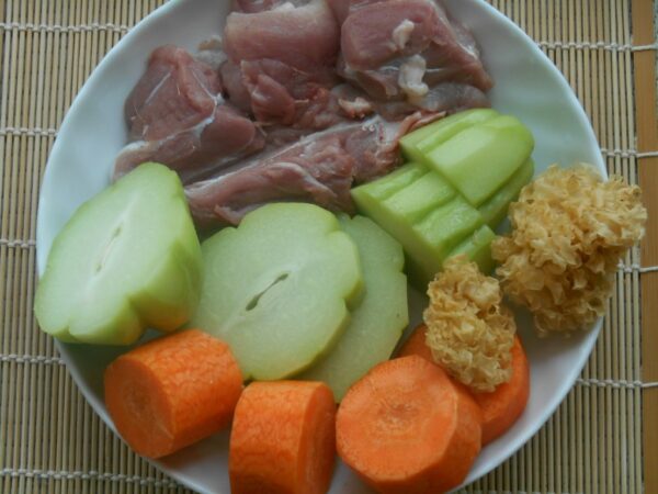 用料是:合掌瓜1個,甘筍1條,雪耳3錢,豬展1隻。