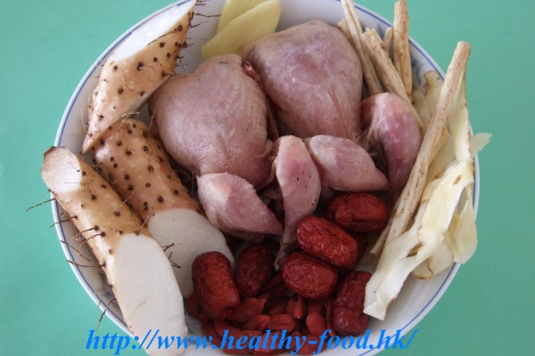 用料是: 鮮淮山4兩,杞子4錢,沙參,玉竹各5錢,生薑3片,紅棗6粒,急凍鵪鶉2隻.