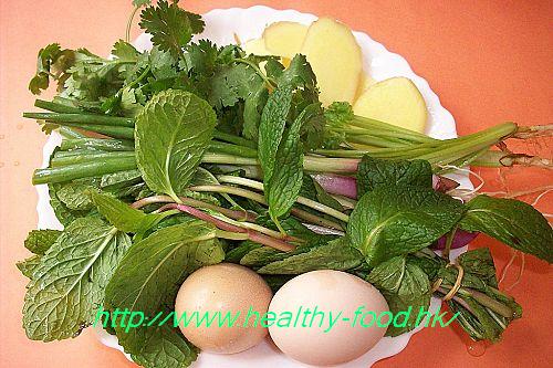 用料是: 香花菜2兩,葱白4根,芫荽2棵,生薑4片,雞蛋1~2個.