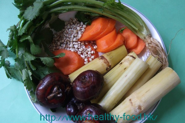 用料是: 竹蔗1扎,馬蹄10粒,甘筍2條,芫荽4棵,生薏米2兩.